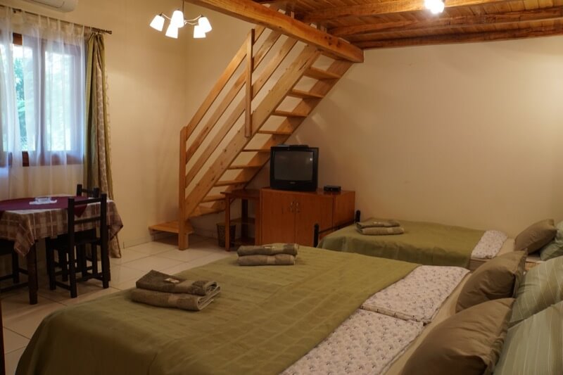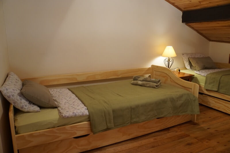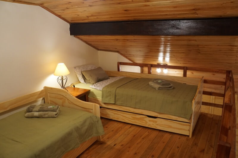 - 2 Einzelbetten und 1 Ausziehkasten-Bett (je 0,9 x 2,0m), für Kinder geeignet, auf voll ausgebauter Innen-Galerie (1. Stock)